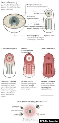 Сутек бомба: уран не плутонийдің ядросы майда бөлшектерге ыдырап, энергия бөліп шыққанша қысады. Мұны бөліну деп атайды.